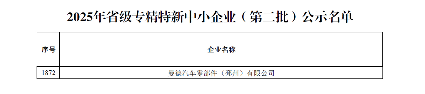 On December 5, 2025, the Jiangsu Provincial Department of Industry and Information Technology officially released the "2025 Provincial-Level Specialized, Refined, Distinctive, and Innovative SMEs (Second Batch) Public List." MIND Automotive Components (Pizhou) Co., Ltd. was included in the list, successfully recognized as a provincial-level "Specialized, Refined, Distinctive, and Innovative SME." This certification signifies authoritative acknowledgment of the company's phased achievements in technological innovation, professional operations, and market development.